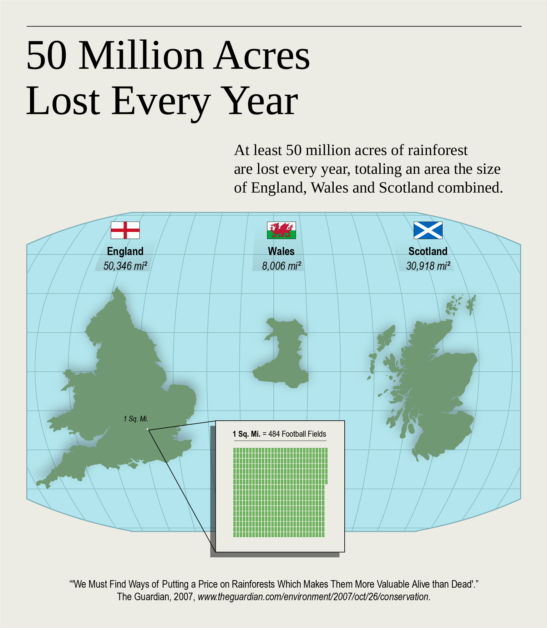More than 50 million acres of rainforest are lost each year. For comparison, this is an area totaling the size of England, Wales, and Scotland combined
